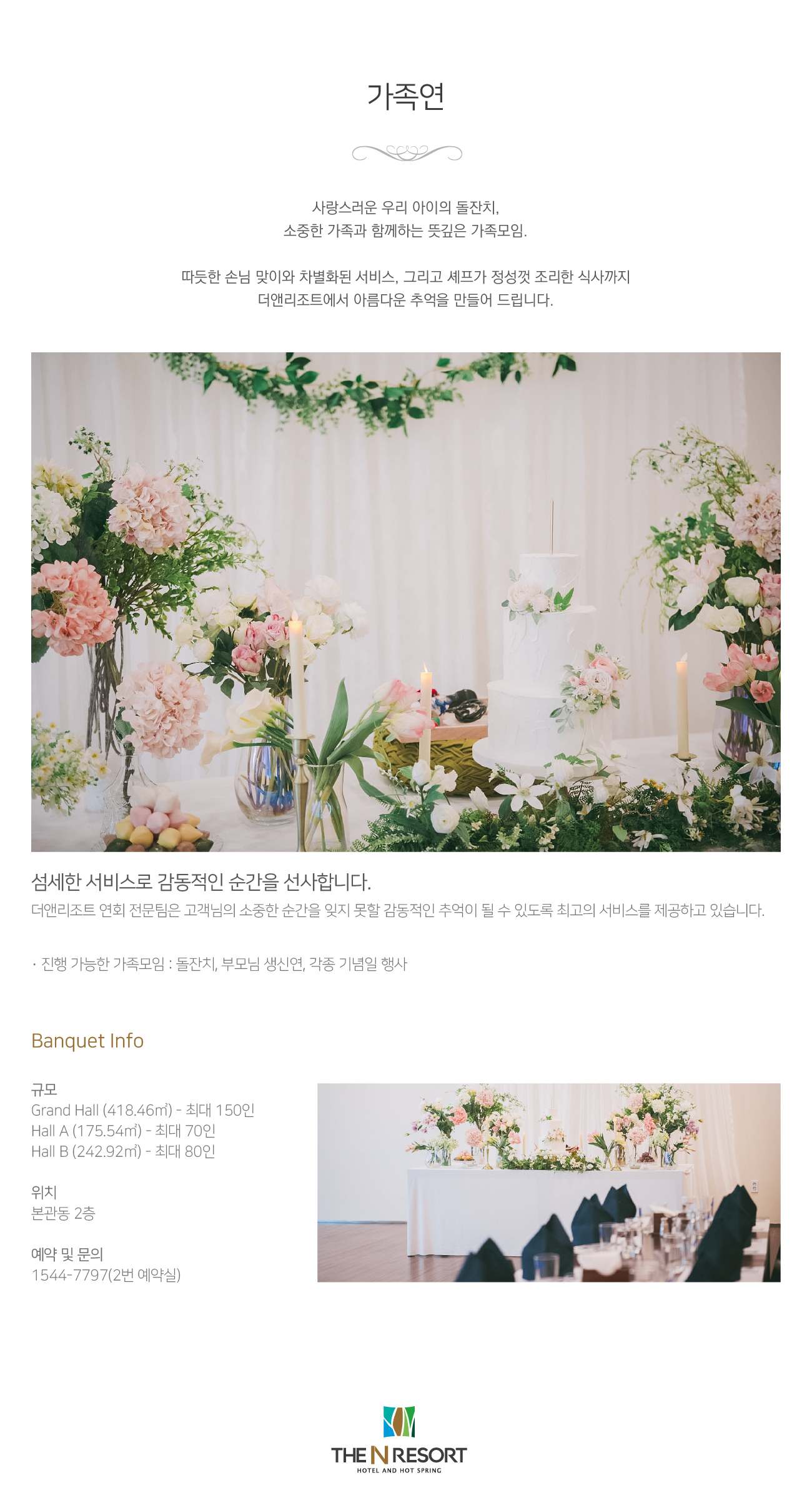 소규모 세미나, 기업 전략회의, 가족연 등 각종 행사가 가능한 연회장입니다.